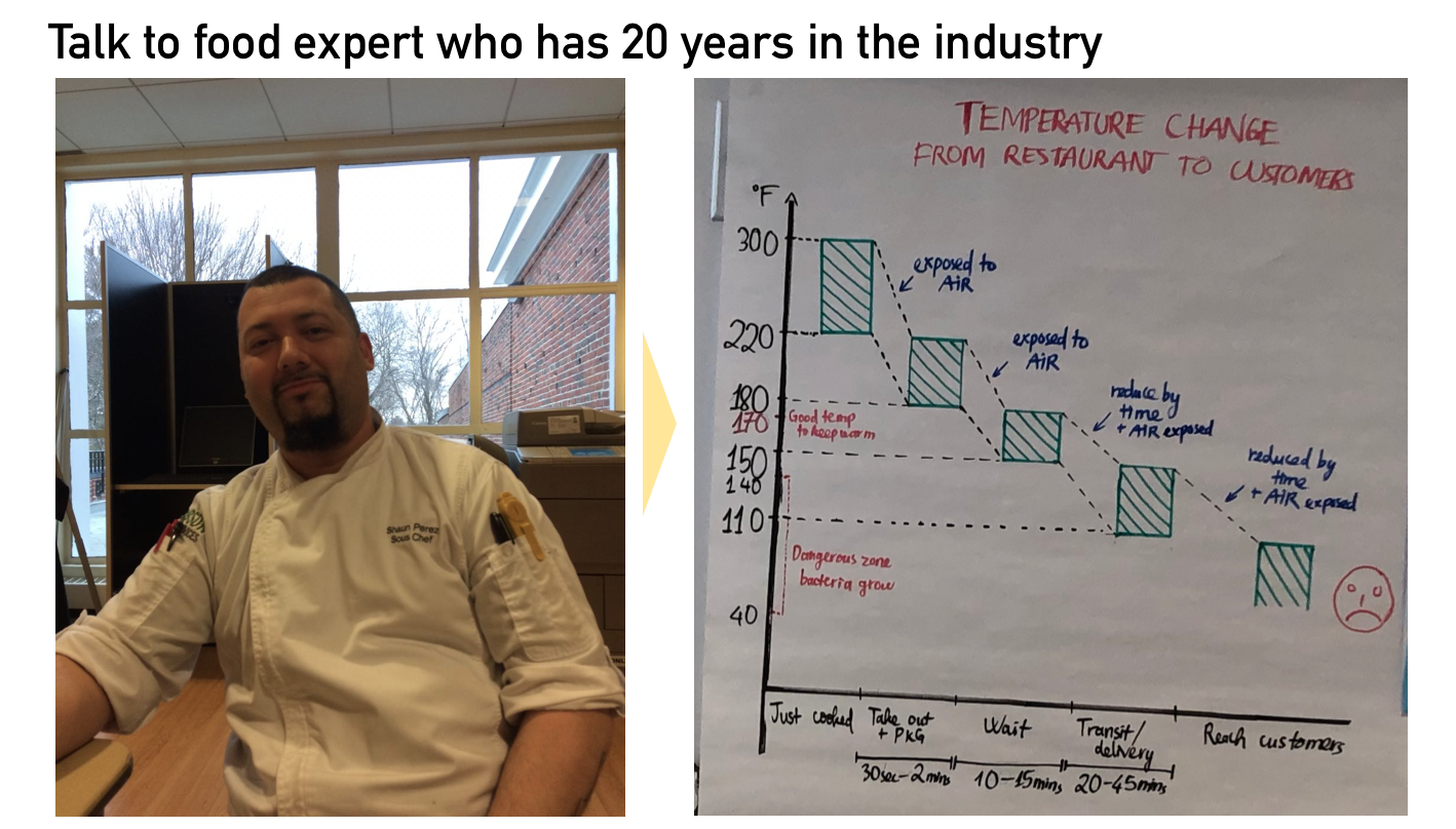 By conducting researches our team realized the pain point that while many customers expect to get good food after waiting for delivery, the food sometimes come with low quality (just lukewarm or even cold). Then digging deeper into delivery process involving delivery platform, restaurants and drivers, we understood that the reasons that lead to this low-quality problem is long delivery time due to traffic or waiting time. And since traffic or waiting time are unexpected, we have been trying to control another factor which is delivery package to keep food hot while being delivered.